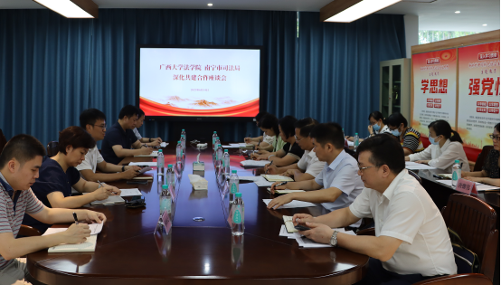 6月14日上午,南宁市司法局党组书记、局长黄有光一行到beat365手机版官网入口调研指导,并与我院召开深化共建合作座谈会。院领导余云宇、邓惠英、陈刚,南宁市司法局副局长侯康顺、三级调研员邓琼冬等参加座谈。