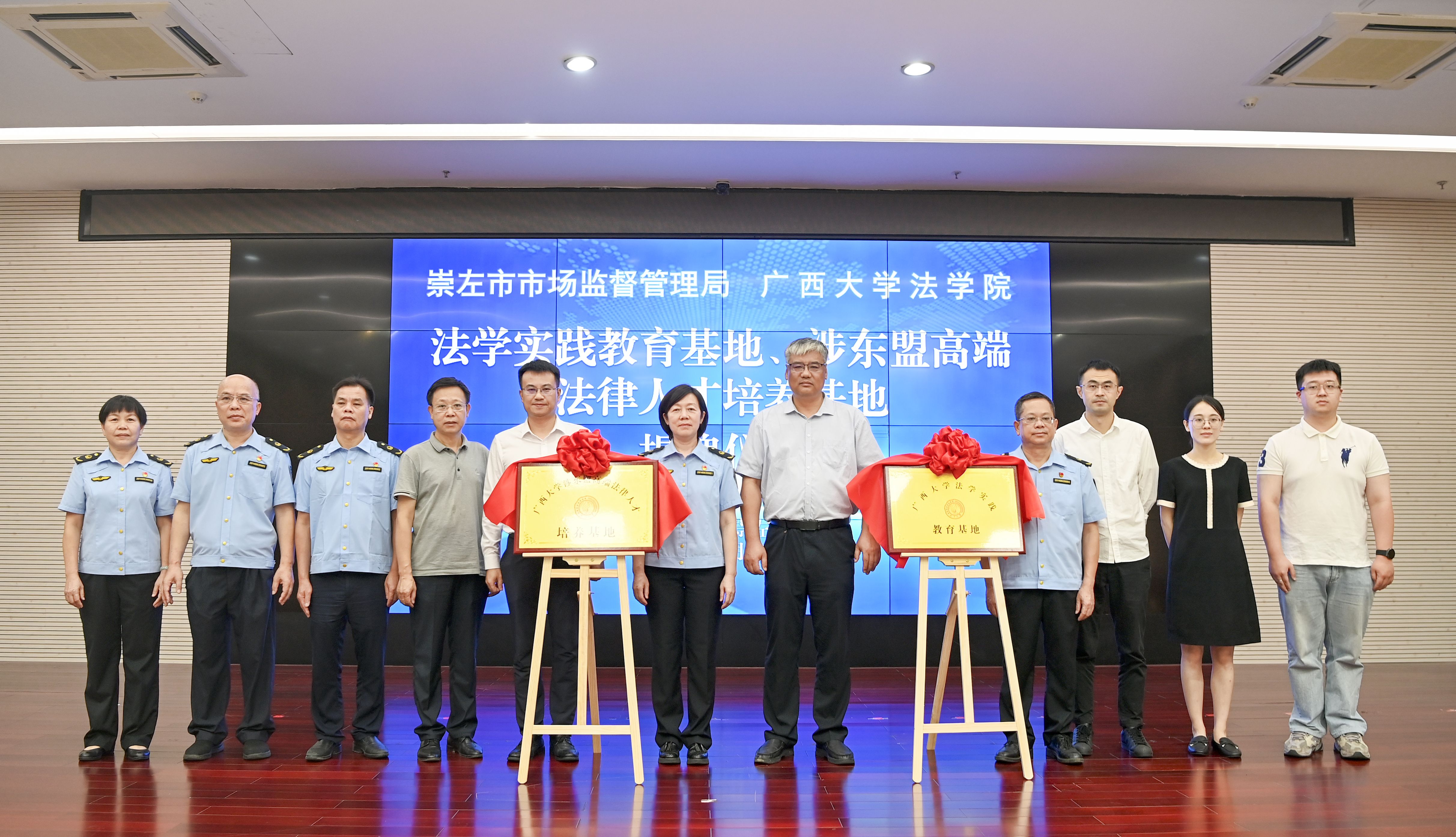 崇左市市场监督管理局、司法局相关负责人与我院领导共同为基地揭牌,在座谈中围绕协议事项内容,探讨如何发挥各自优势,在涉外法治理论和实务研究、涉外法治人才培养等领域推动深度合作。