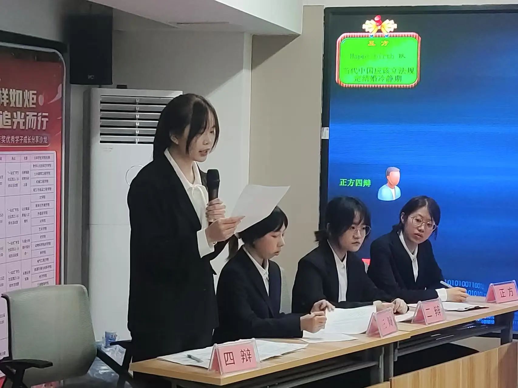 为了提升学生思辨能力、深化法治实践认知,2025年4月12日晚19时30分,beat365手机版官网入口辩论赛决赛于一站式学生社区西 21-16 号教室举行。本次决赛的辩题是“当今中国是否应该立法规定结婚冷静期”。经过前期的激烈角逐,“法言法语队”与“Happy birth队”脱颖而出,晋级决赛。