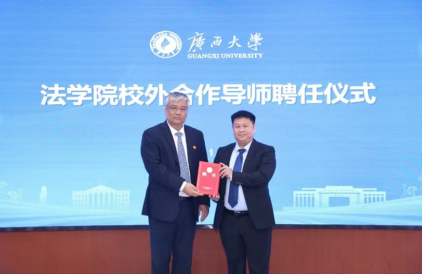 广西冠益律师事务所主任吕伟良代表受聘导师上台发言,他作为校友分享了自身的求学经历、执业经验与法治感悟,对同学们提出了“深耕专业、践行法治”的殷切期望。