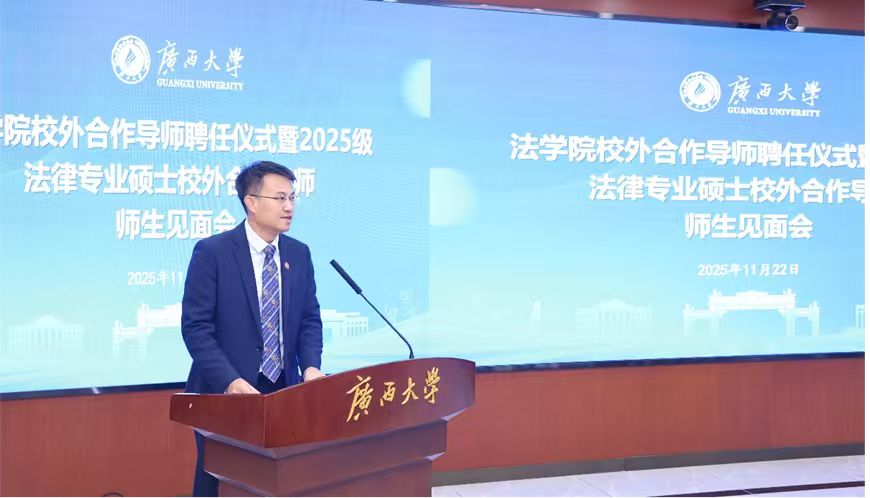 院党委书记余云宇在致辞中向受聘的校外合作导师表示热烈欢迎和衷心感谢。他指出,此次聘任仪式是beat365手机版官网入口深入学习贯彻习近平法治思想,贯彻落实中办国办印发的《关于加强新时代法学教育和法学理论研究的意见》,深化研究生教育教学改革的重要举措。校外导师们深耕法律实务一线,拥有丰富的实践经验和深厚的行业积淀,是学院人才培养体系中不可或缺的重要力量。他寄语2025级法硕新生们在各位合作导师的指导下锤炼专业本领、提升职业素养,努力成长为知行合一的复合型法律人才。余云宇还结合广西大学教师队伍师德师风建设的要求,对新聘的校外合作导师提出了廉洁从教、规范履职、协同育人、助力就业发展等方面的具体工作建议,并表达了与法律实务界持续深化合作、共建高质量实践教学平台的美好愿景。