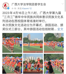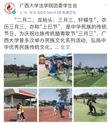 学生们积极参加广西大学第九届“三月三”民族文化系列活动,通过参与射箭、抢糍粑、高脚马、高杆投绣球、滚铁环、打陀螺、踢毽子、和球等民族传统体育项目,加深广大师生对壮族文化的认识,增强同学们对民族团结的感受。同时,充满趣味性的线上民族知识问答和“云上对山歌”比赛也让同学们体验了中华文化的博大精深,增进各族学生的交流交往交融。