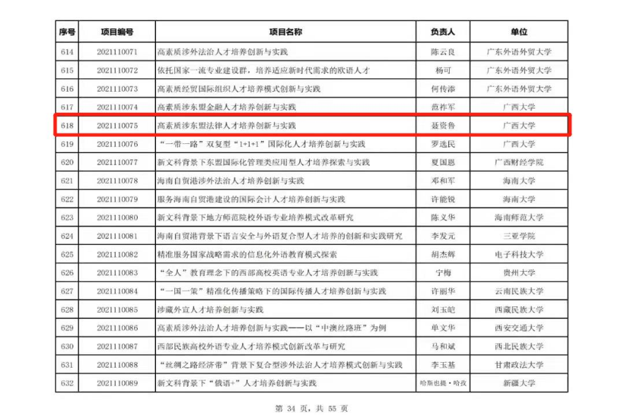 近日,教育部高等教育司公布了首批新文科研究与改革实践项目拟立项项目名单,我院院长聂资鲁教授主持的《高素质涉东盟法律人才培养创新与实践》获批立项。