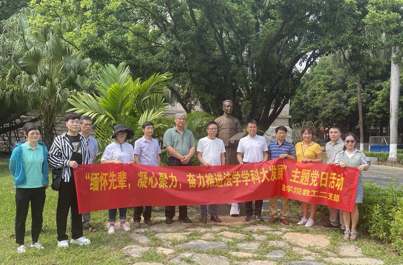 支部党员来到育才广场雕塑园,在白鹏飞、张志让先生铜像前,集体瞻仰并敬献鲜花,表达对两位著名的法学家的无限景仰与崇高敬意。院党委书记余云宇作为支部成员,向在场同志介绍了白鹏飞等大师雕像的设计制作历程,特别提到白鹏飞任广西大学校长期间延聘众多知名学者与进步教授来西大讲学,张志让教授在国立广西大学任教期间致力于民主进步救国斗争,都为广西大学的发展做出了巨大贡献。他介绍道,学校九十周年校庆前夕建成的大师雕塑园,有包括大师级校长、著名社会科学家、著名自然科学家的雕像共25尊,其中白鹏飞、张志让先生曾在西大法律系任教,都是中国当代著名的法学家、法学教育家,作为beat365手机版官网入口的一员,我们应当循着先辈们的足迹,赓续奋进力量,踏实做好人才培养和教育工作,扎实推进广西大学法学学科向前发展。