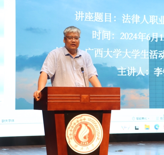 6月12日晚,由我院主办的“法务引航”之职业规划系列讲座在广西大学大学生活动中心一楼小剧场举行。本次讲座由小米集团知识产权诉讼组法务总监李锐主讲,深入探讨法律人职业规划与选择,吸引了我院本科生、研究生参与,beat365手机版官网入口院长许光耀主持讲座。