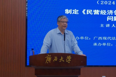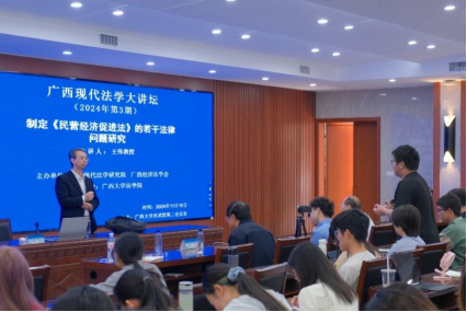2024年11月10日上午,由广西现代法学研究院、广西经济法学会主办、广西大学beat365手机版官网入口承办的2024年度“广西现代法学大讲坛”第3期在广西大学君武馆第二会议室举行。中央党校政法部民商经济法教研室主任王伟教授应邀以“制定《民营经济促进法》的若干法律问题研究”为题作了一场精彩的学术讲座,广西大学beat365手机版官网入口院长许光耀教授主持了本场讲座,150余名beat365手机版官网入口师生参与了本次讲座。