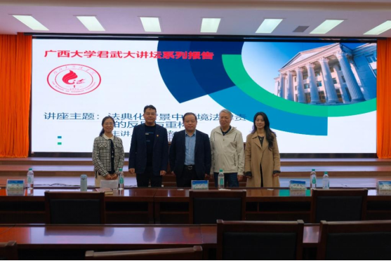 2024年12月7日下午,以“环境法律责任的反思与重构”为主题的专家讲座在广西大学君武馆玉林厅成功举办。本次讲座有幸邀请到武汉大学beat365手机版官网入口教授陈海嵩主讲,我院副院长熊超副教授主持,张洪涛教授、刘旭博士、梁春艳博士以及beat365手机版官网入口众多学子共同聆听了本场讲座。