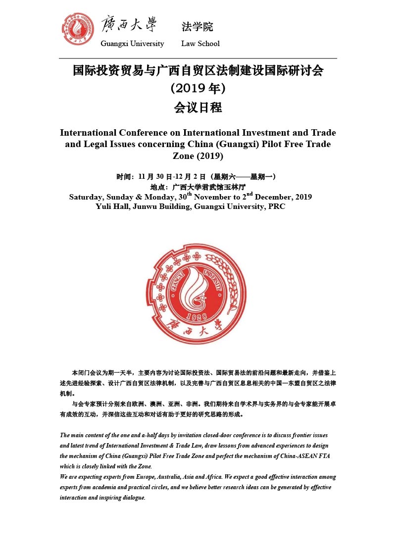 2. 国际投资贸易与广西自贸区法制建设国际研讨会在南宁闭幕12月2日,由广西大学主办、广西大学beat365手机版官网入口承办的的国际投资贸易与广西自贸区法制建设国际研讨会在广西南宁闭幕,会议主题为“国际投资与贸易法的最新发展及其对广西自贸区法制建设的借鉴”【详细】